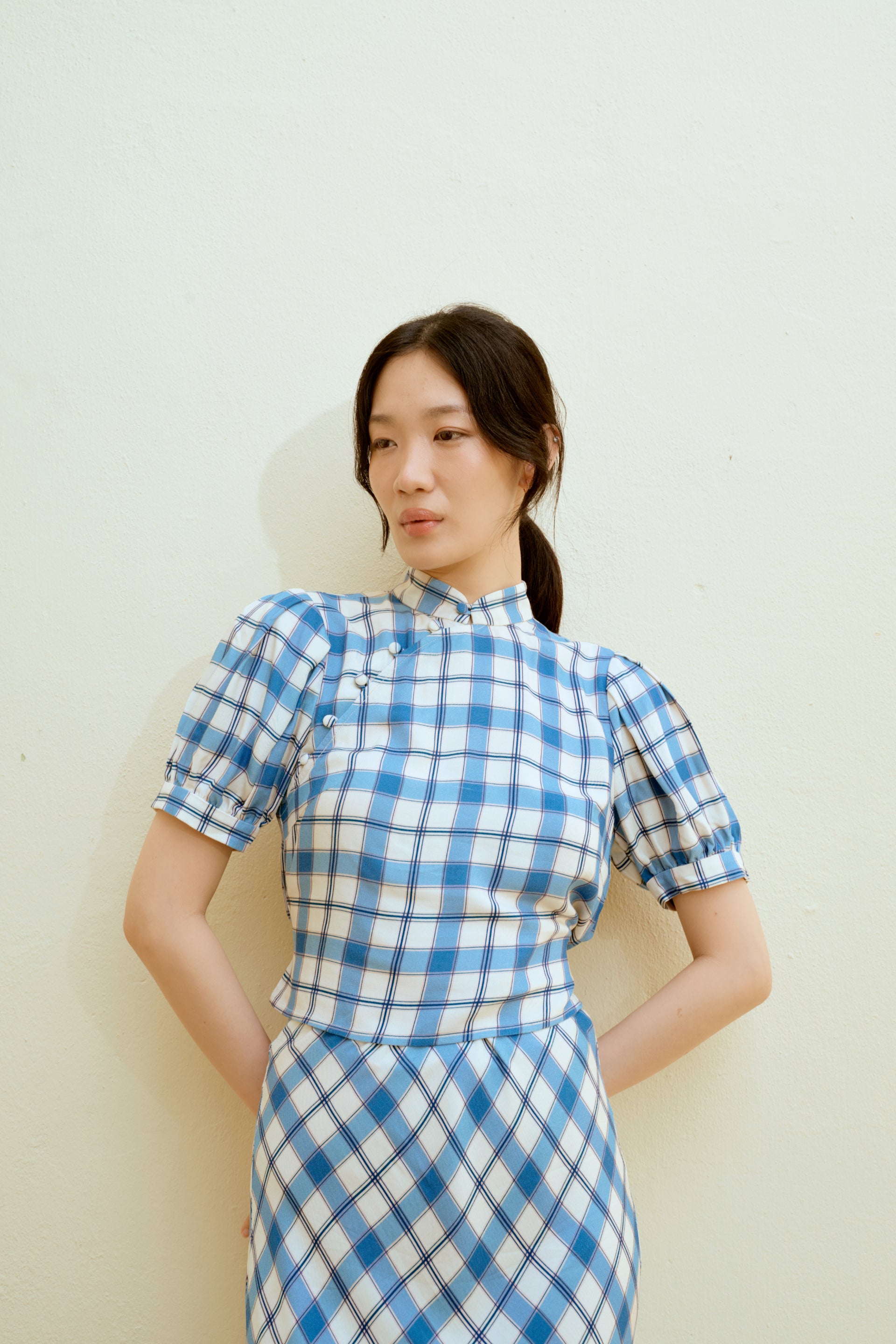 This checkered print is originally sourced from a cotton fabric, and specially printed on rayon for the Big Sister set. An extra hit of vintage with quite the perfect puff sleeves and a ribbon tie that wraps gently round the waist. We promise you’ll turn heads in this elegant Cheongsam inspired number. Inspired by Big Sister - easygoing, relaxed and diligent.