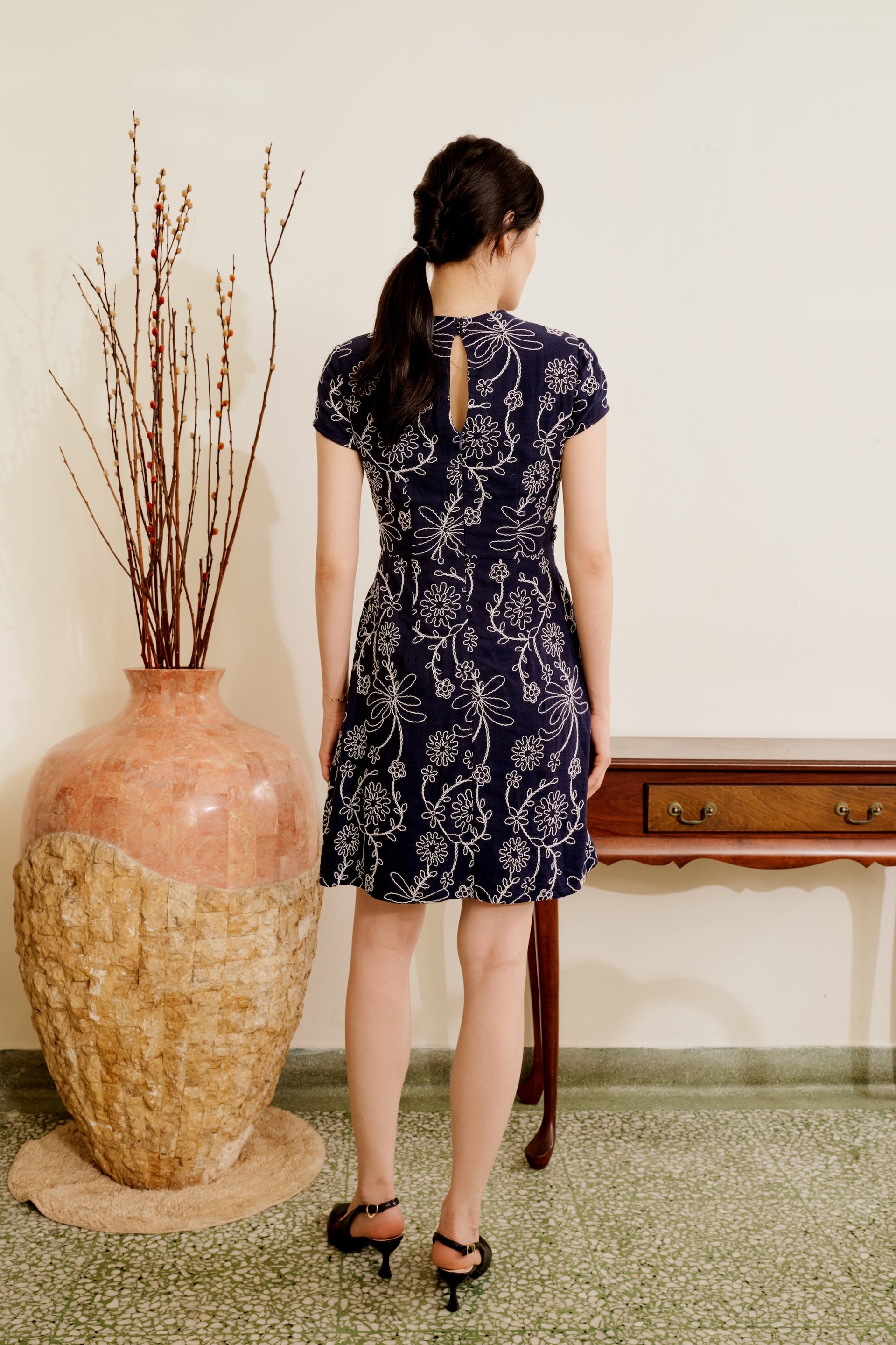 A form-fitting dress that hugs in all the right places, Cherish mini dress returns in a unique embroidered black floral fabric, found in the Cambodian markets. Featuring off-center looped buttons detailing, this short dress is sure to turn heads with the high crew neckline and cap sleeves reminiscent of a modern cheongsam.
