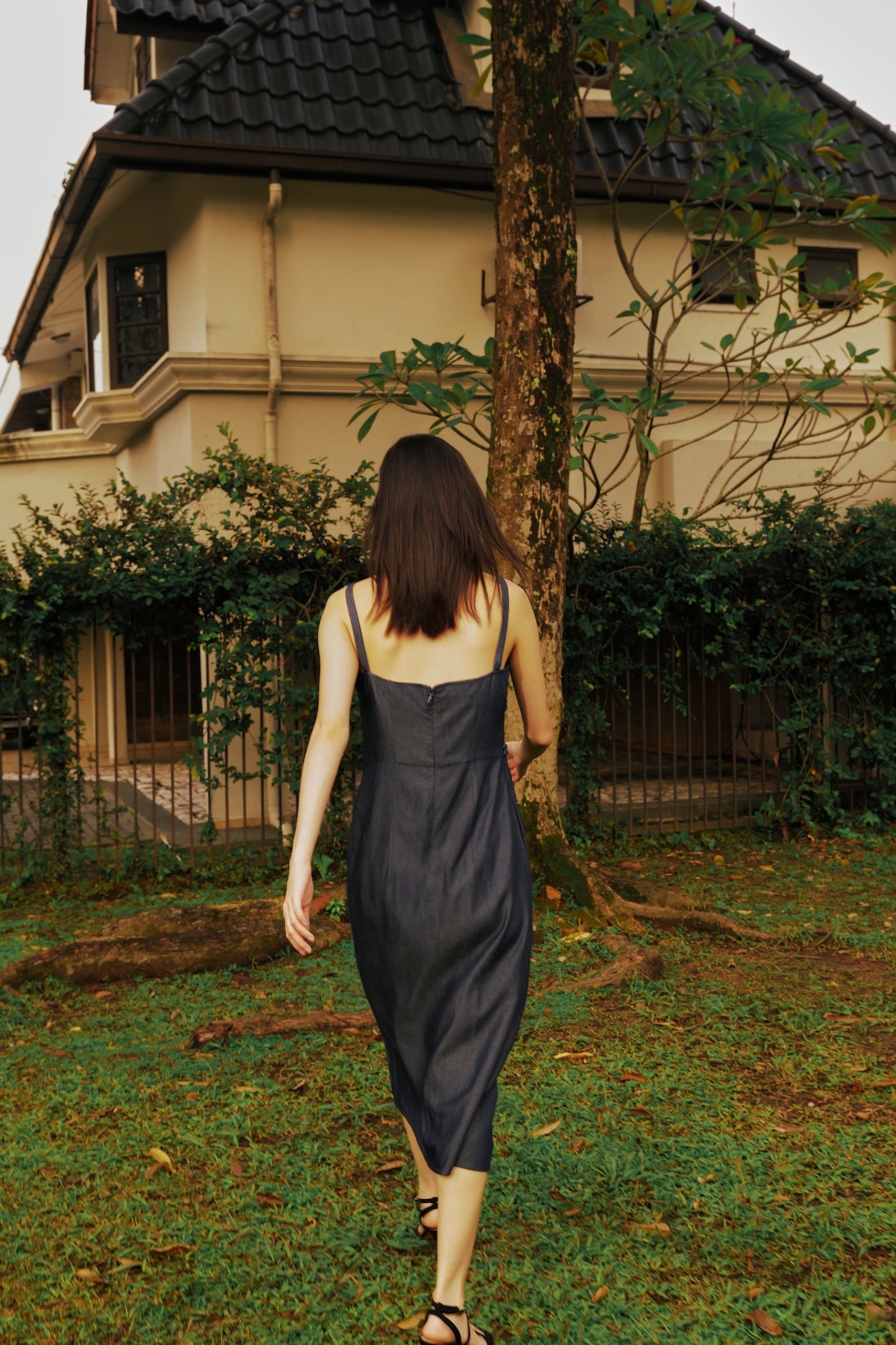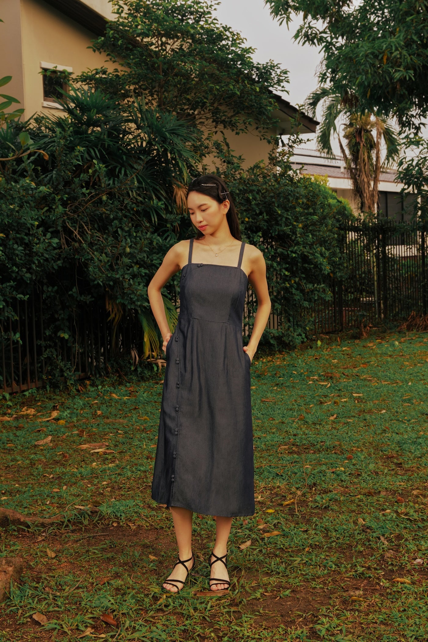 Our bestselling Cherish dress from Chapter 1 is reimagined in a new all-occasion strappy dress. Featuring fabric buttons down the front and side of the dress for a streamlined silhouette reminiscent of the cheongsam, in a lightweight linen with denim handfeel.