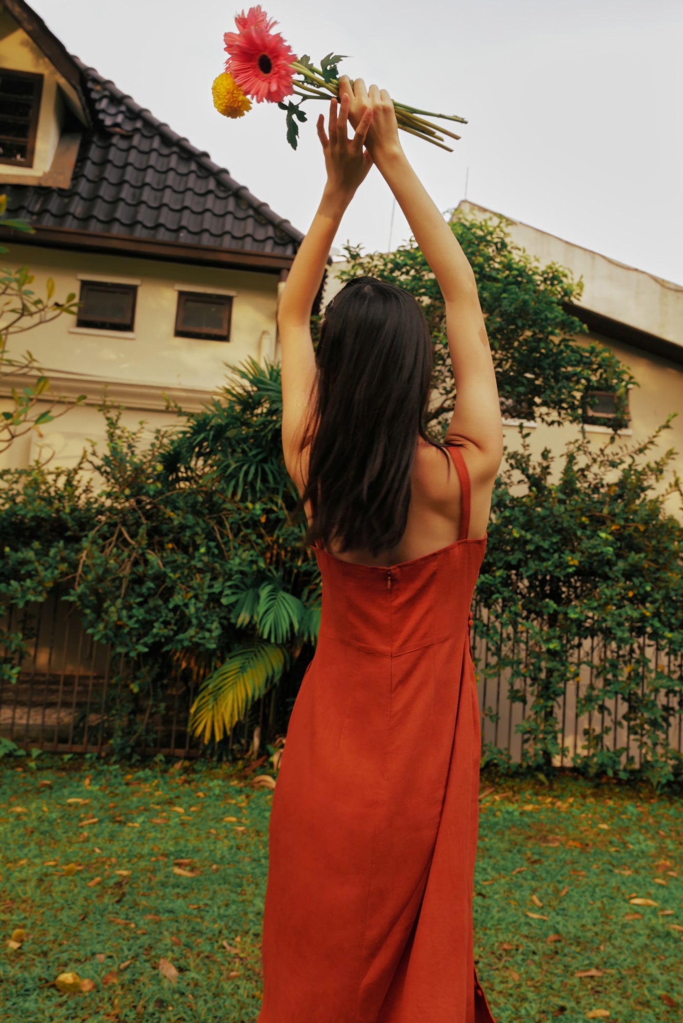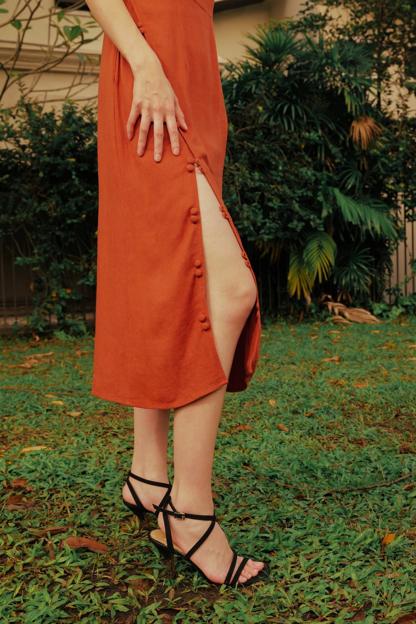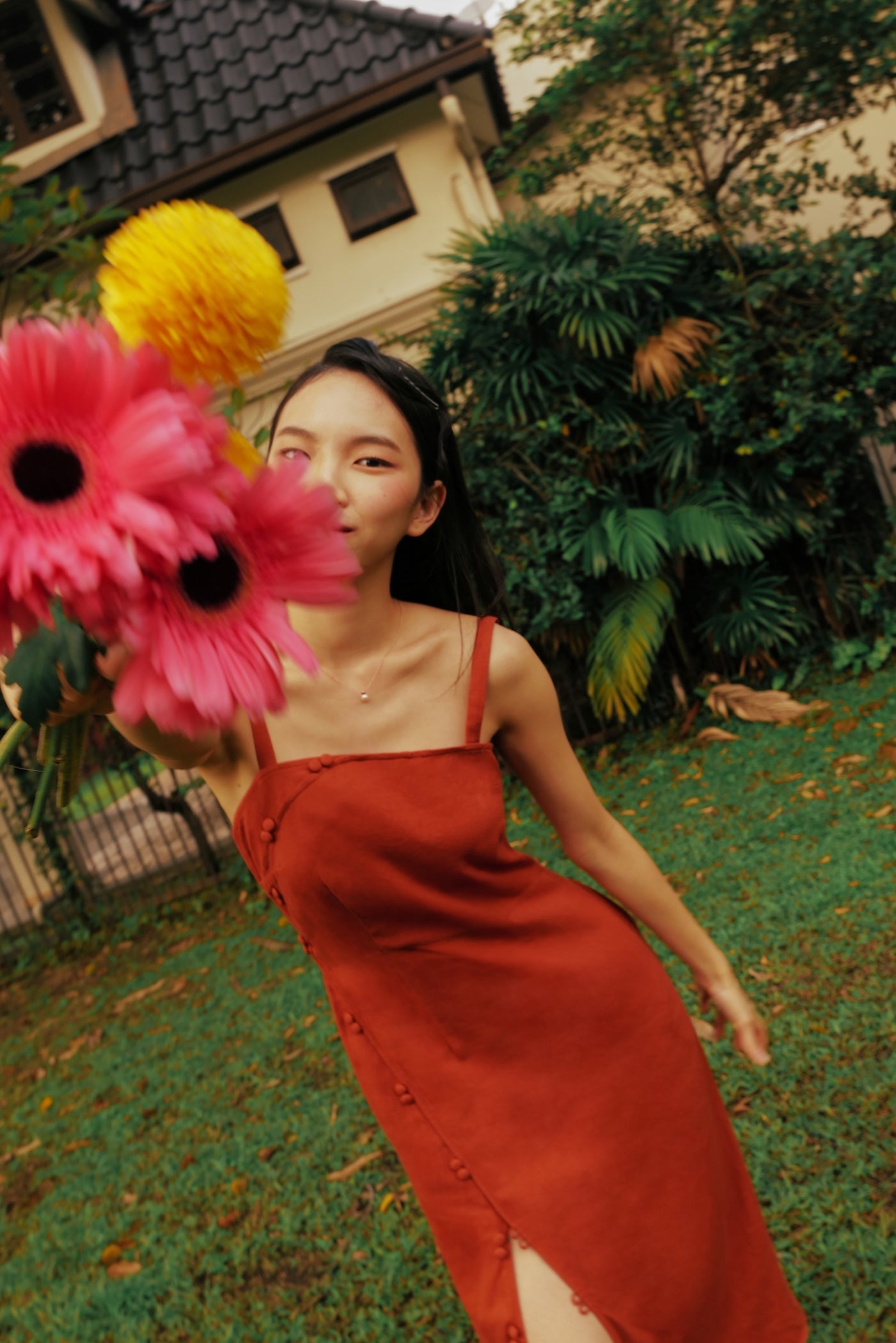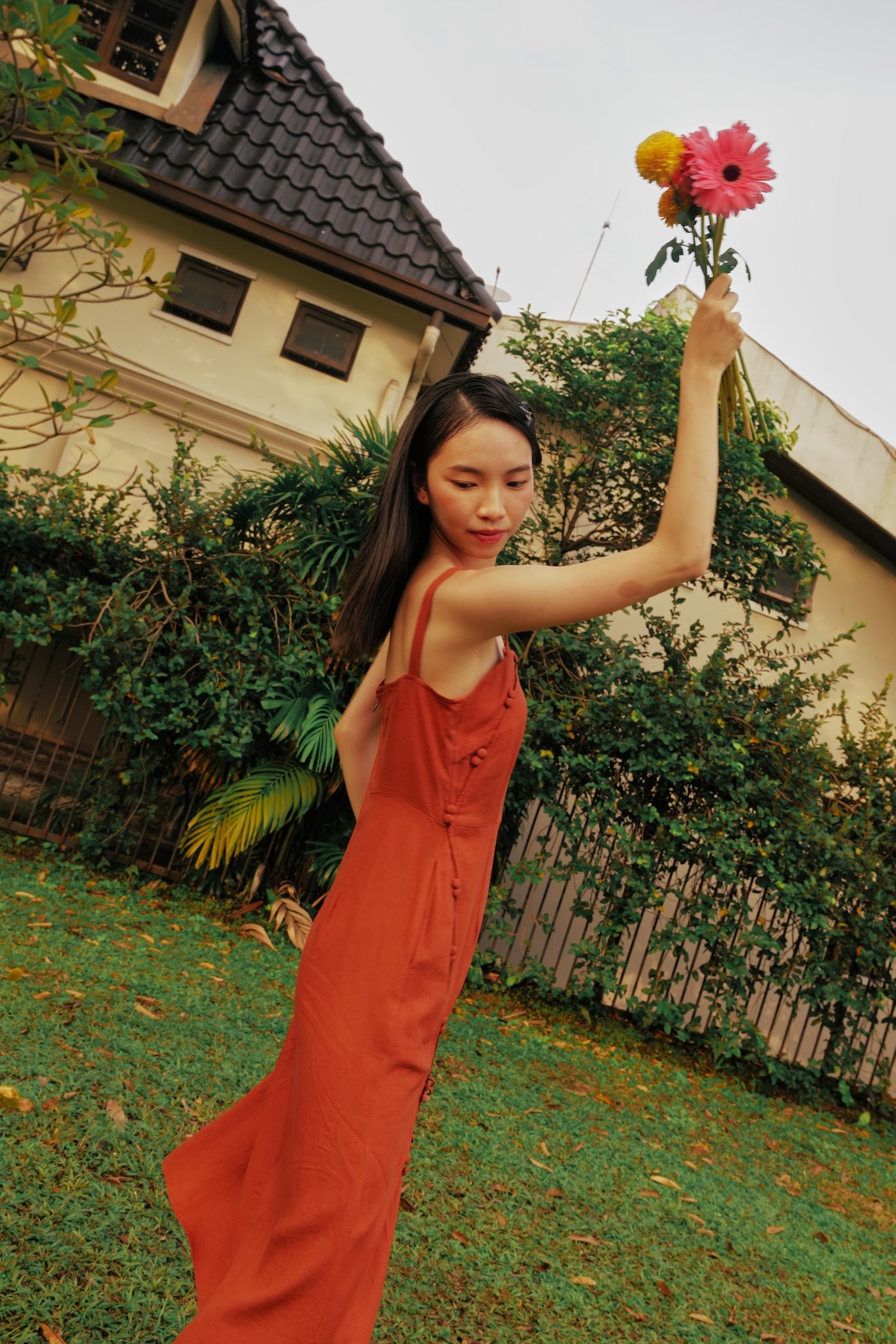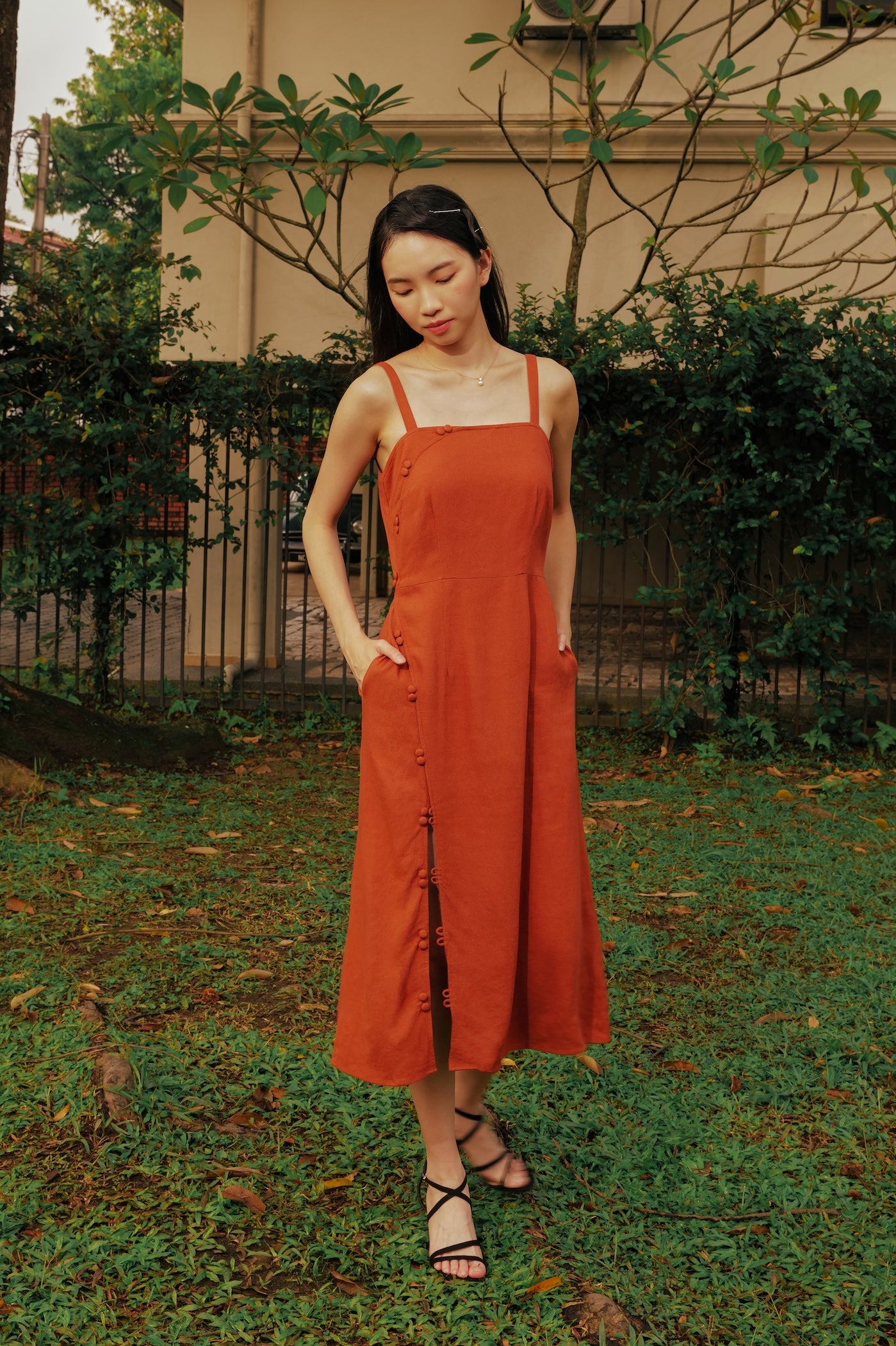 Our bestselling Cherish dress from Chapter 1 is reimagined in a new all-occasion strappy dress. Featuring fabric buttons down the front and side of the dress for a streamlined silhouette reminiscent of the cheongsam, in a lightweight linen.