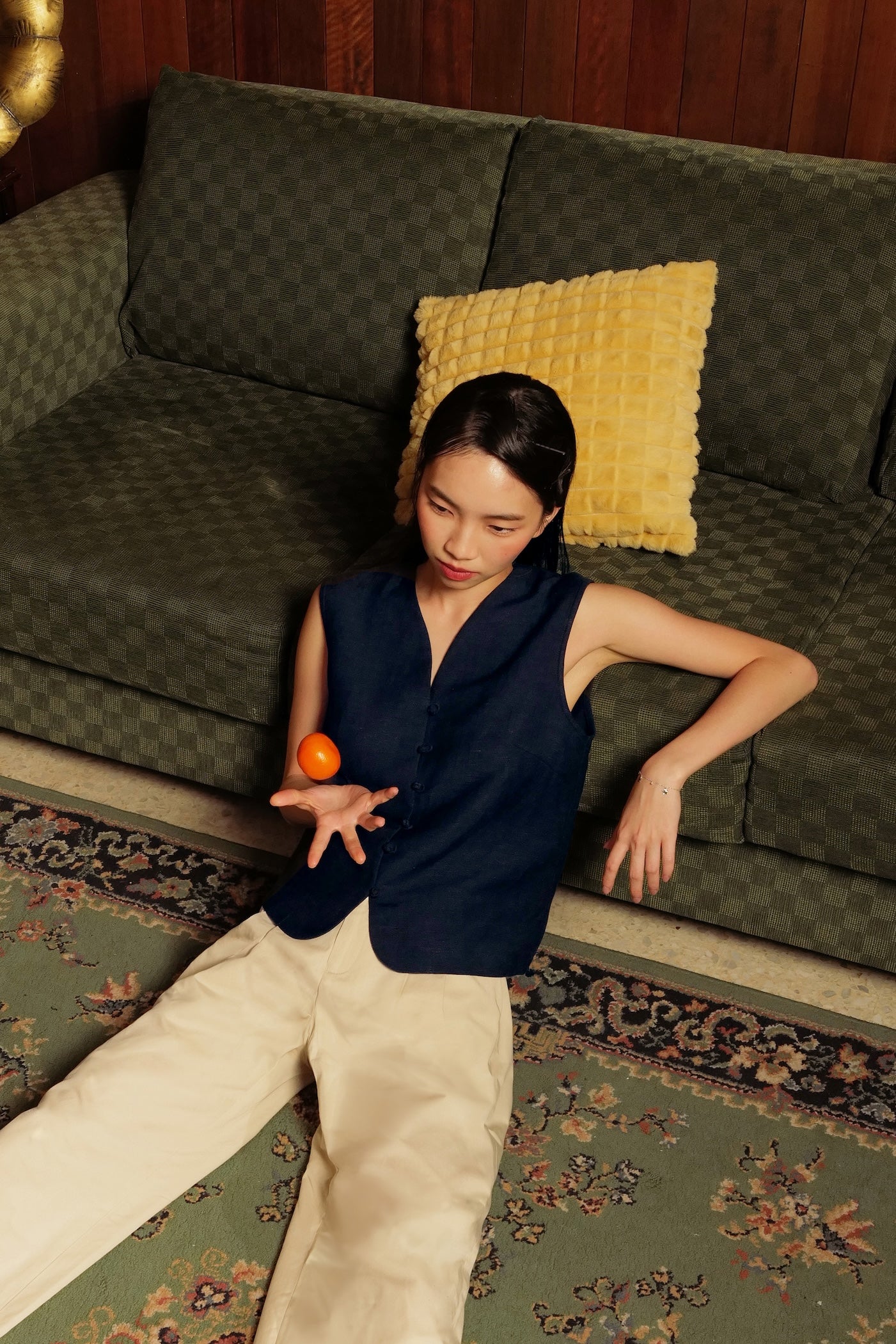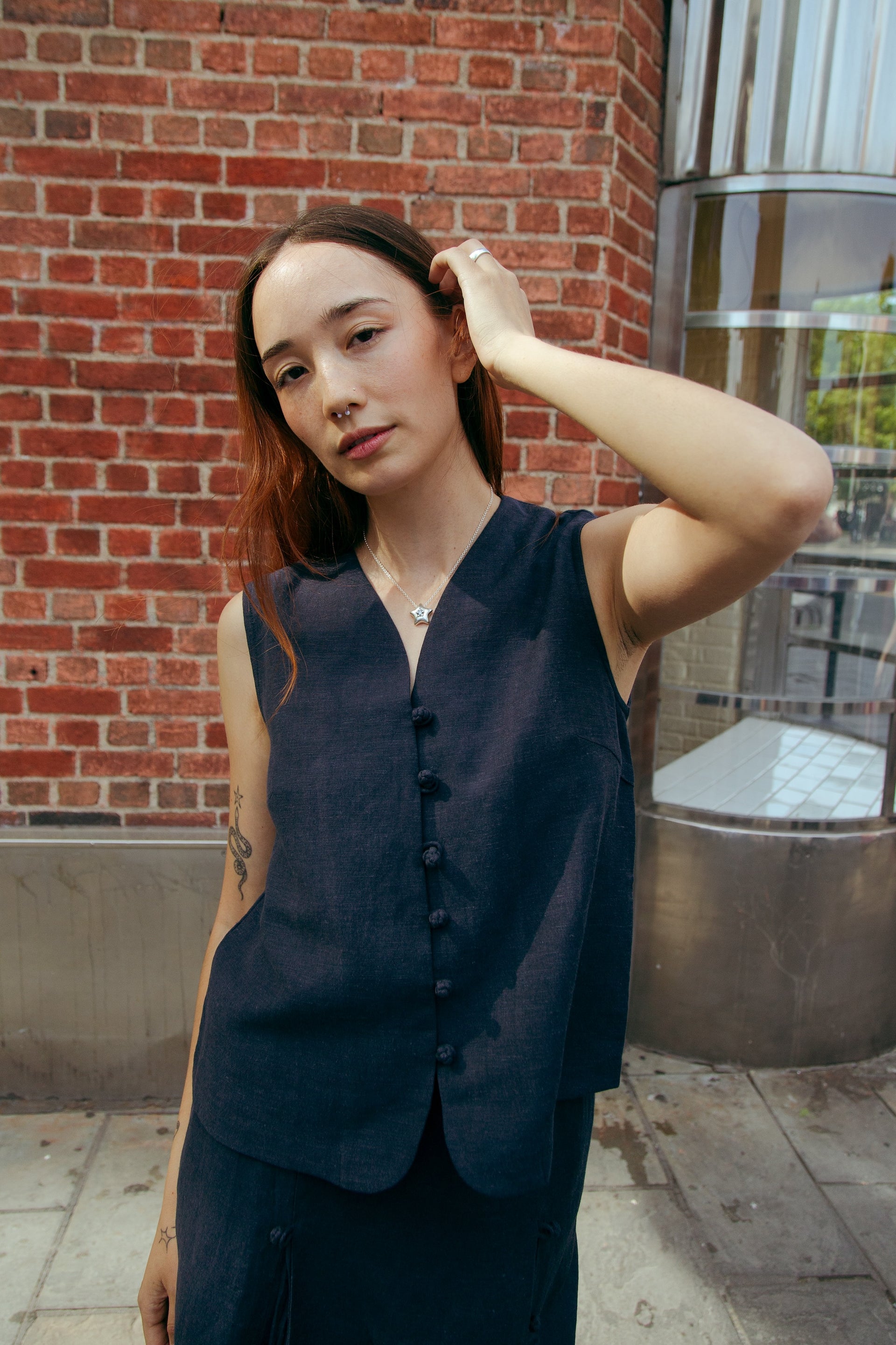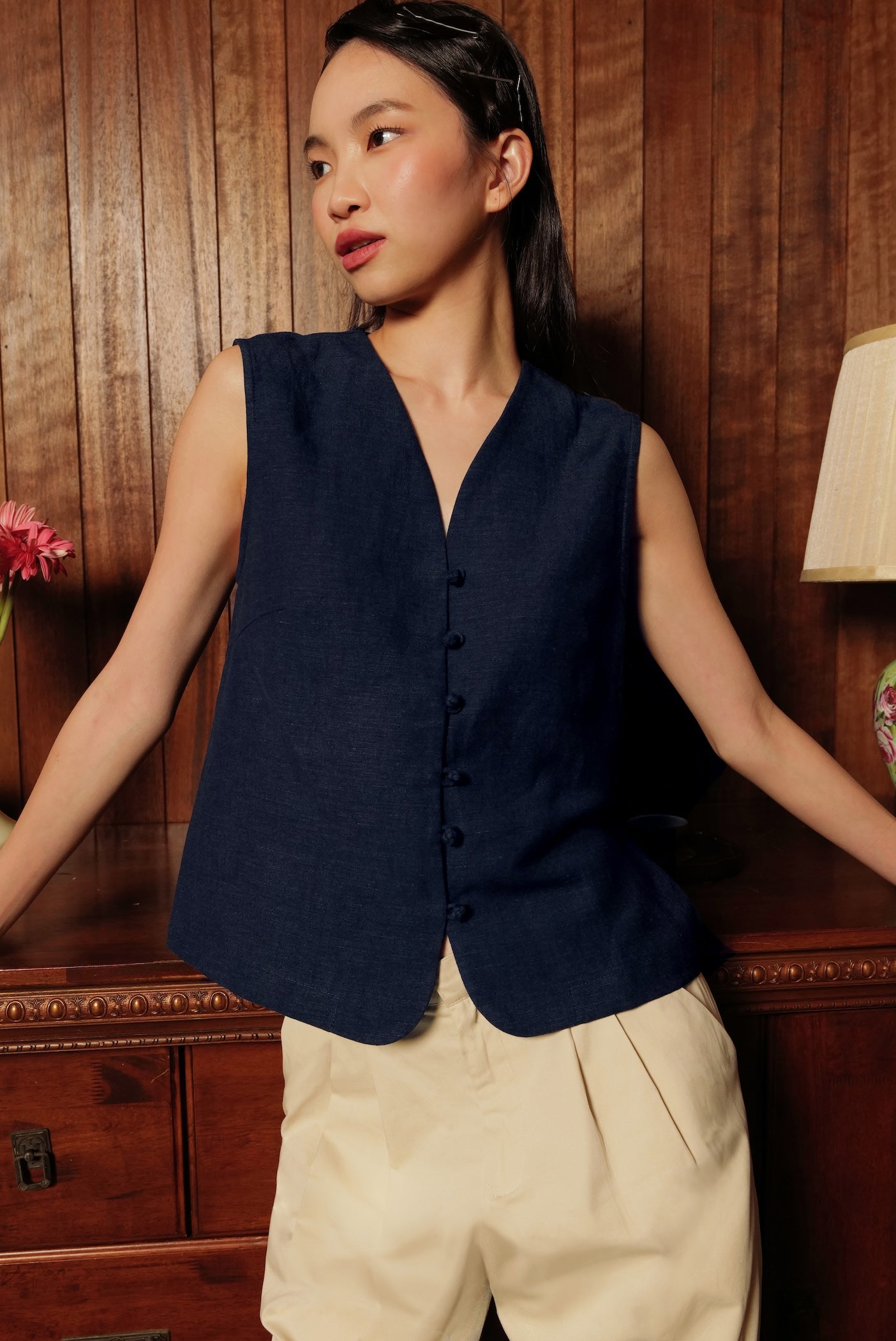 Our new classic - a vest top, finished with a nostalgic twist with chinese knotted buttons down the front for those forget-me-knot moments.