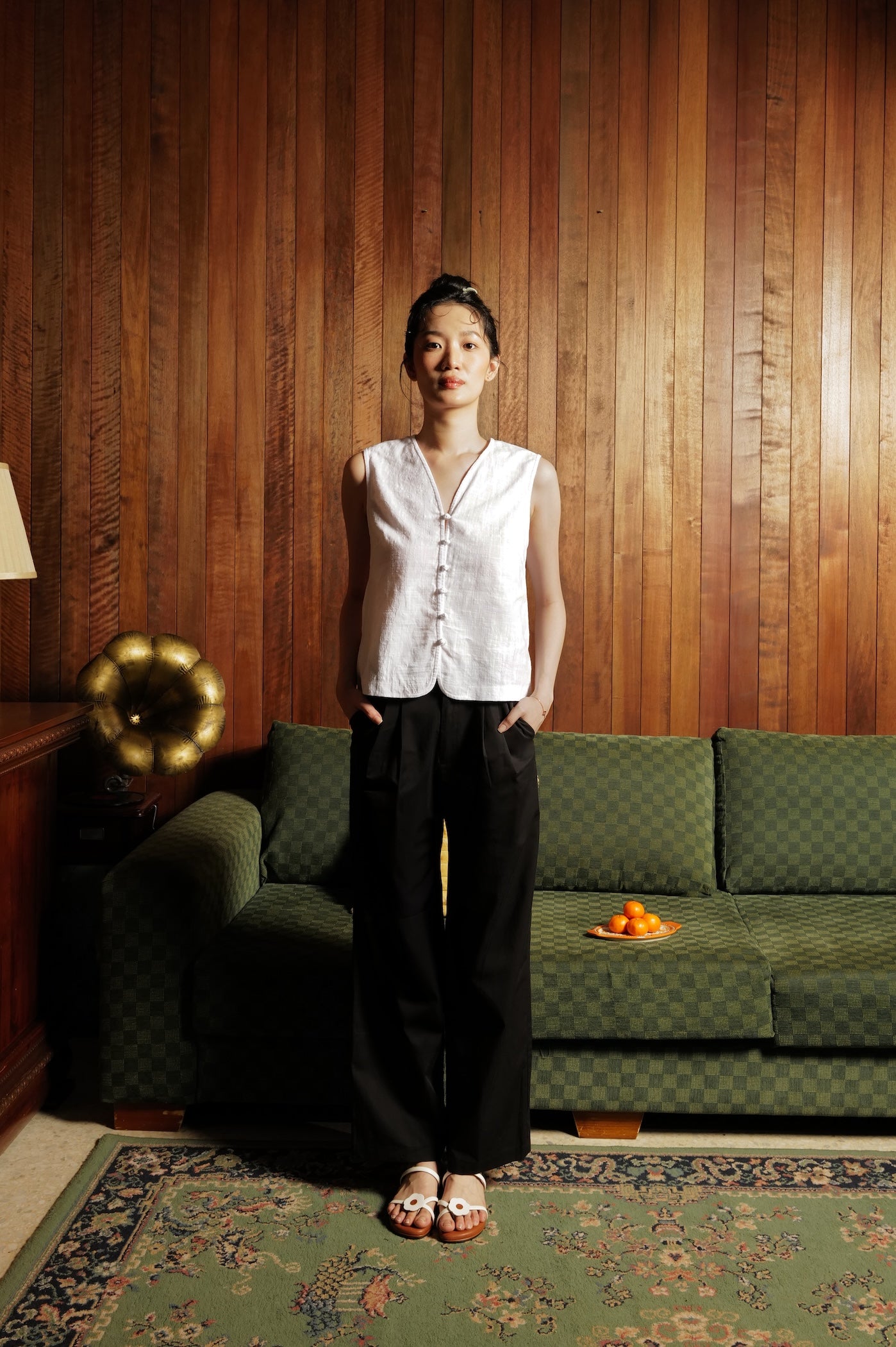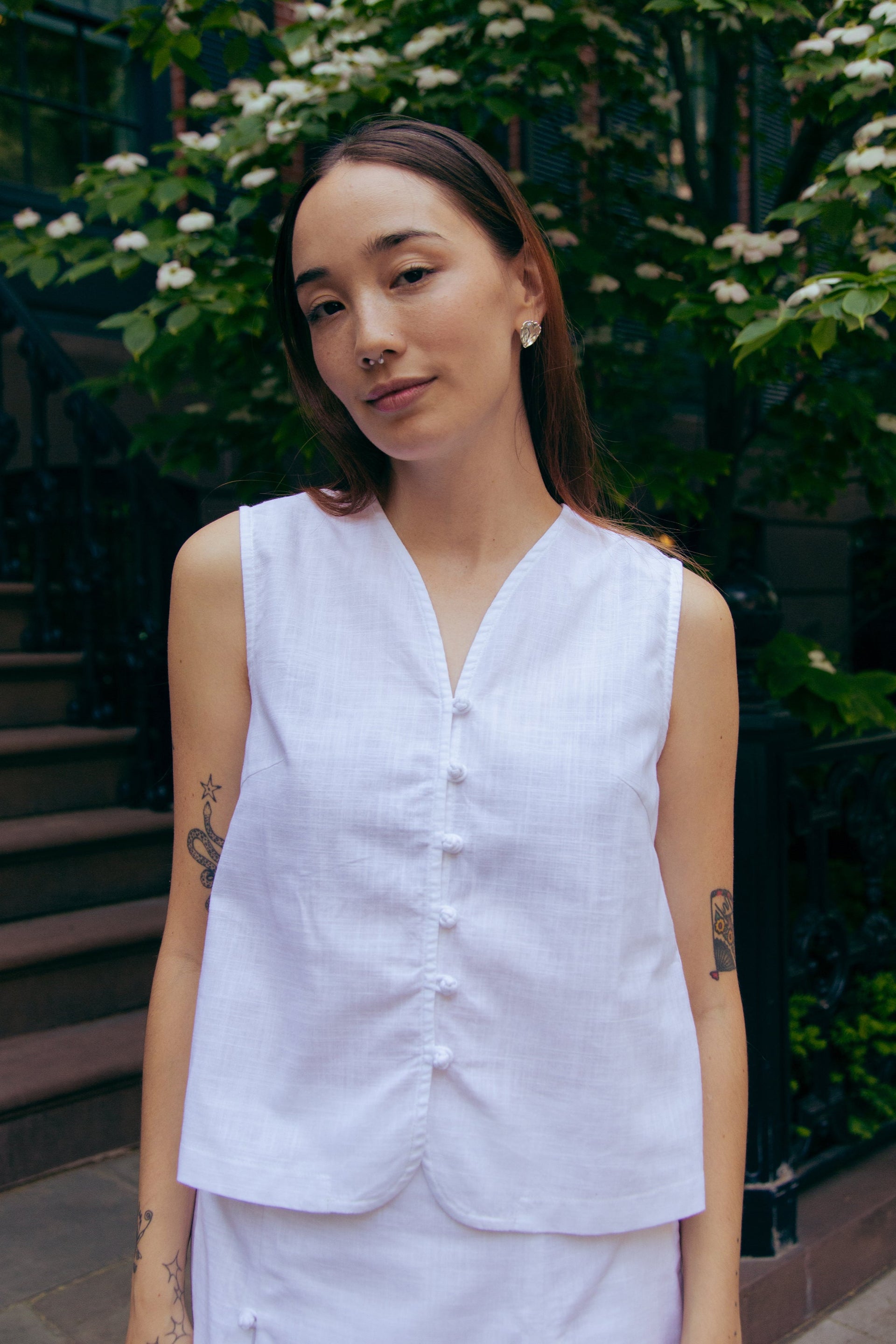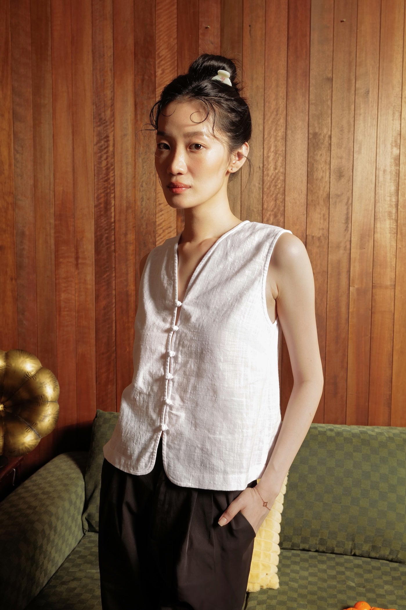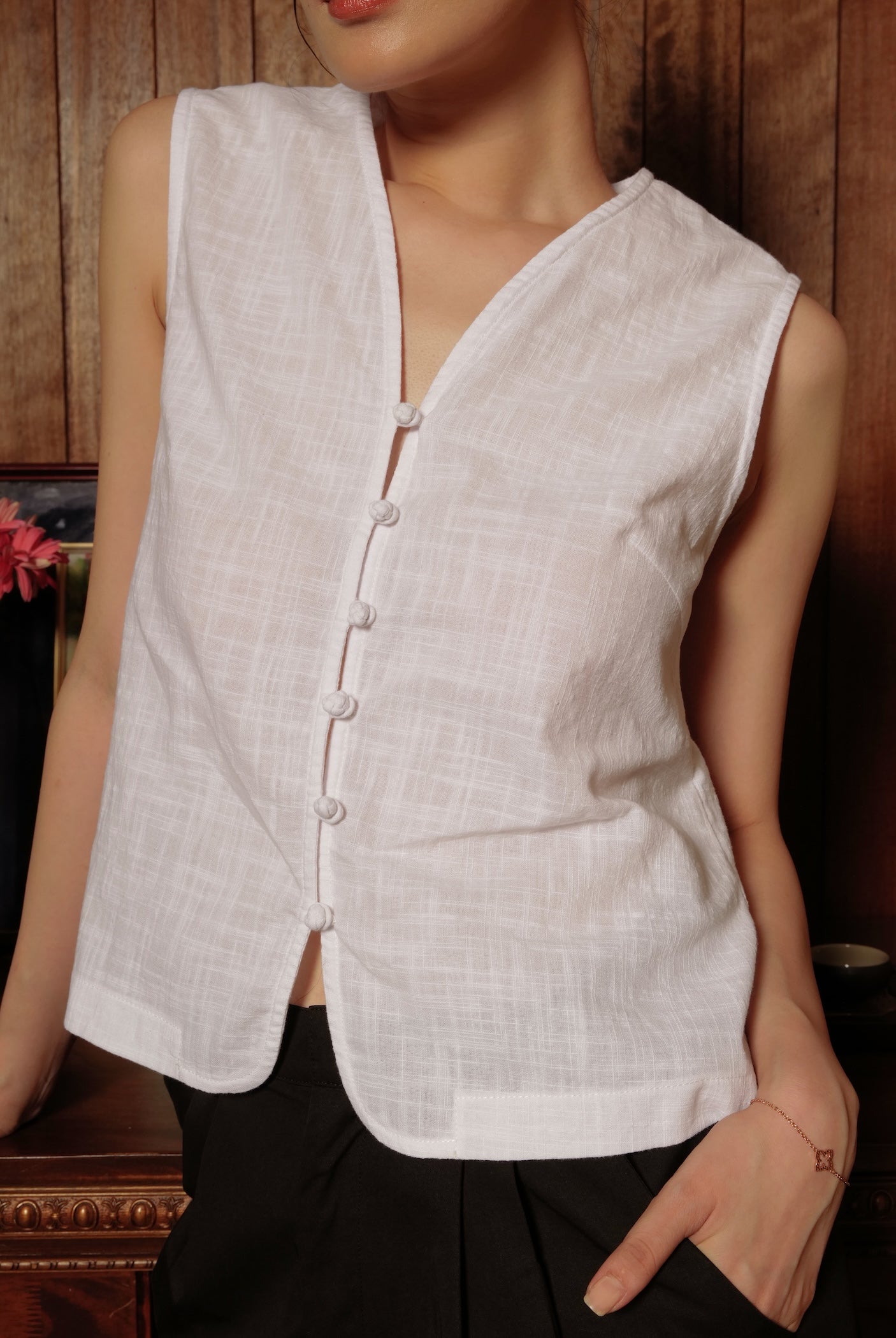 Our new classic - a vest top, finished with a nostalgic twist with chinese knotted buttons down the front for those forget-me-knot moments.