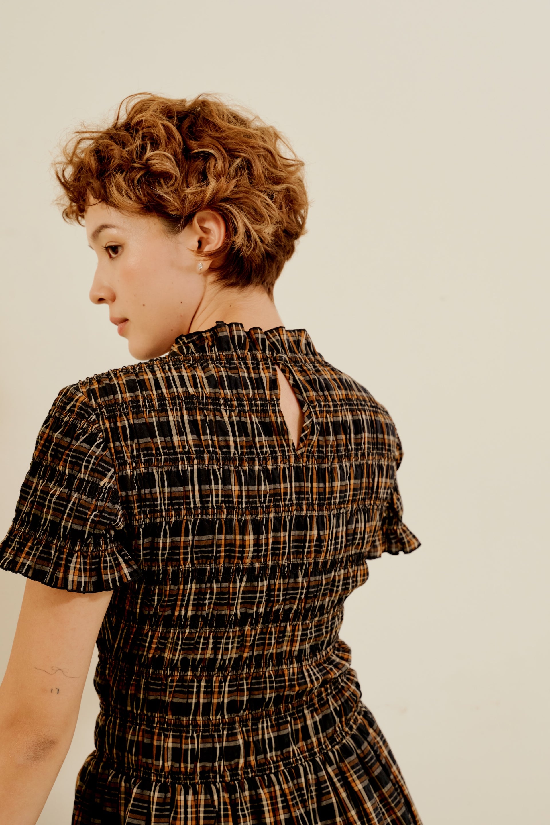 Gather Dress - as it is named- is inspired by our favorite gatherings - always warm like a hug with her flexible and comfy fit across the bust, waist and sleeves with ruching detail across the bodice through the front and back. Adorned with a slightly dropped waist, full flare skirt and natural pearl button closure at the back.