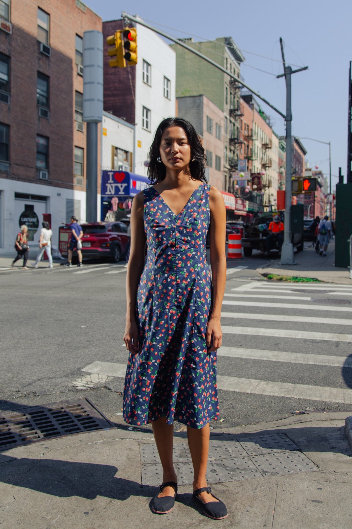 Sample piece of the Muse Dress in a strawberry 100% cotton japanese fabric, Size M. The piece is in perfect condition and the same cutting as the final Muse Dress, but the back zipper is white.
