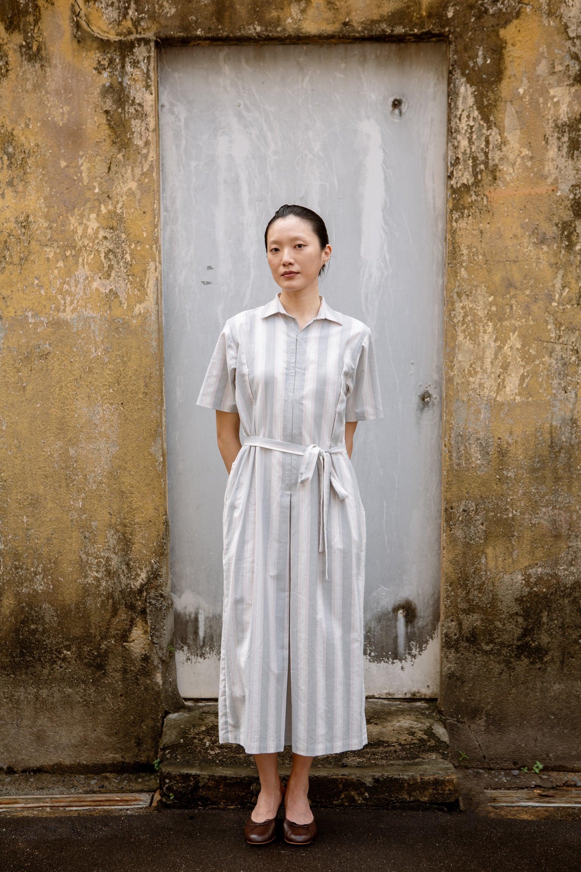 The OG samfu shirtdress is everything vintage meets modern - adapted for your movement, comfort and nostalgia. Oversized and boxy, made of crisp and comfy 100% cotton fabric. This cloudy blush stripe fabric is a limited edition deadstock fabric. Wear it with or without the sash belt at the waist.